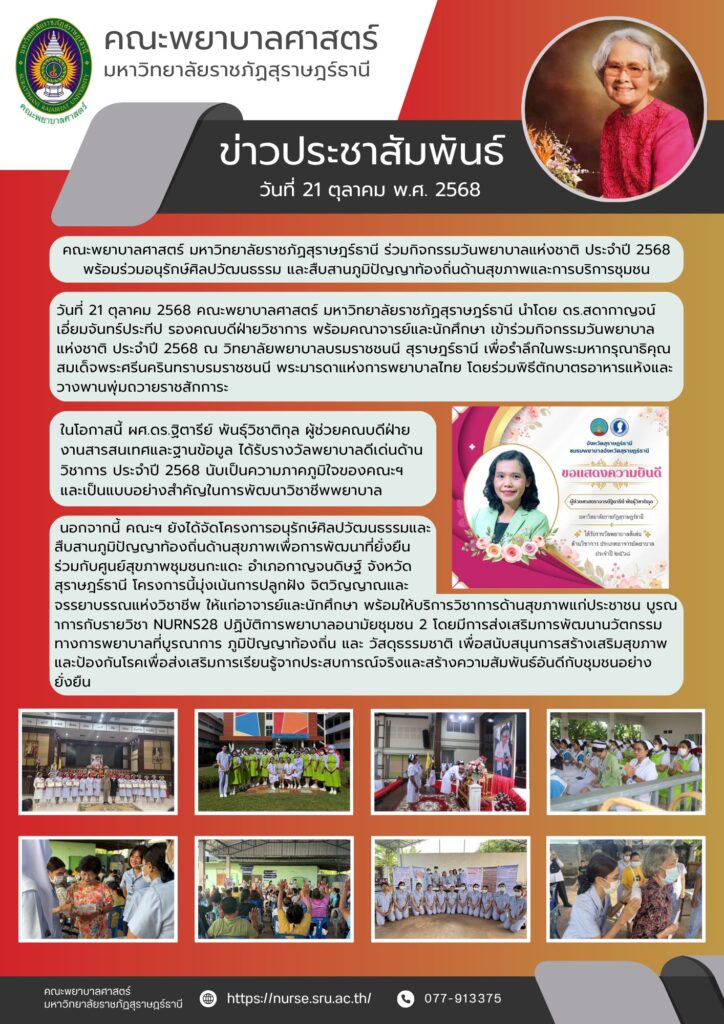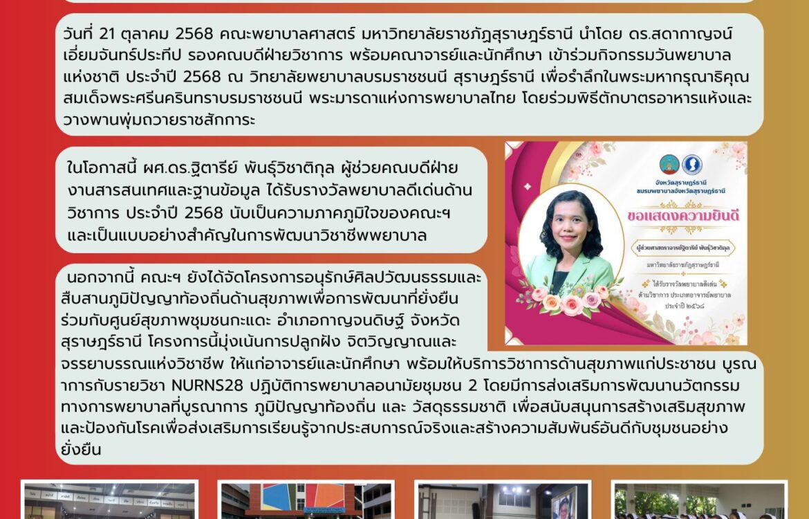 คณะพยาบาลศาสตร์ มหาวิทยาลัยราชภัฏสุราษฎร์ธานี ร่วมกิจกรรม “วันพยาบาลแห่งชาติ ประจำปี 2568” พร้อมสืบสานภูมิปัญญาท้องถิ่นและศิลปวัฒนธรรมด้านสุขภาพ